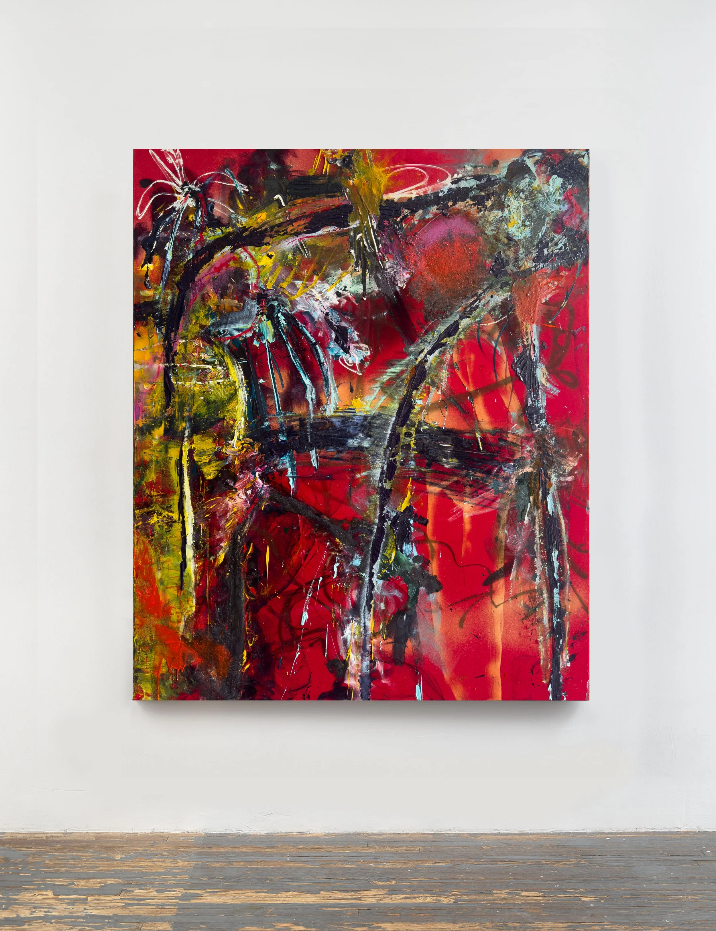Abstract painting with vibrant red background, featuring chaotic black, white, and yellow brushstrokes, with hints of blue and green, displayed on a wall.